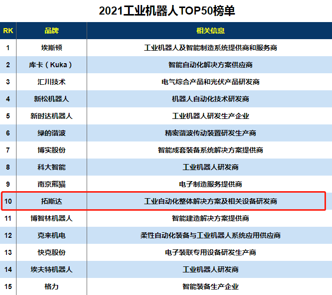 此前,拓斯達(dá)亦入選“2021工業(yè)機(jī)器人TOP 50”“2021廣東企業(yè)500強(qiáng)”榜單,分別位列第10名、第417名。