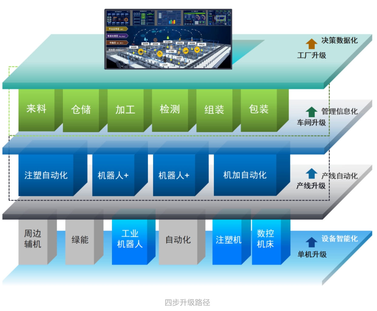 在當前激烈競爭的環(huán)境下,企業(yè)需要同時降低成本和提高智能化水平。為此,采取以下四個步驟,從裝備智能化到產(chǎn)線自動化,再到智能整廠的升級。