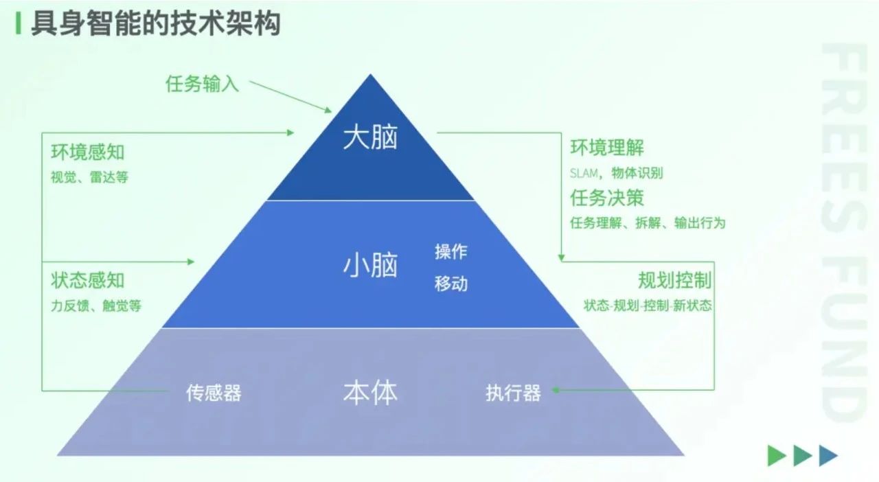 【身體】負(fù)責(zé)行動(dòng),包含機(jī)器人的物理結(jié)構(gòu)和執(zhí)行器,它根據(jù)小腦層的運(yùn)動(dòng)規(guī)劃,實(shí)際操作機(jī)器人的各個(gè)關(guān)節(jié)和組件,完成既定的任務(wù)。