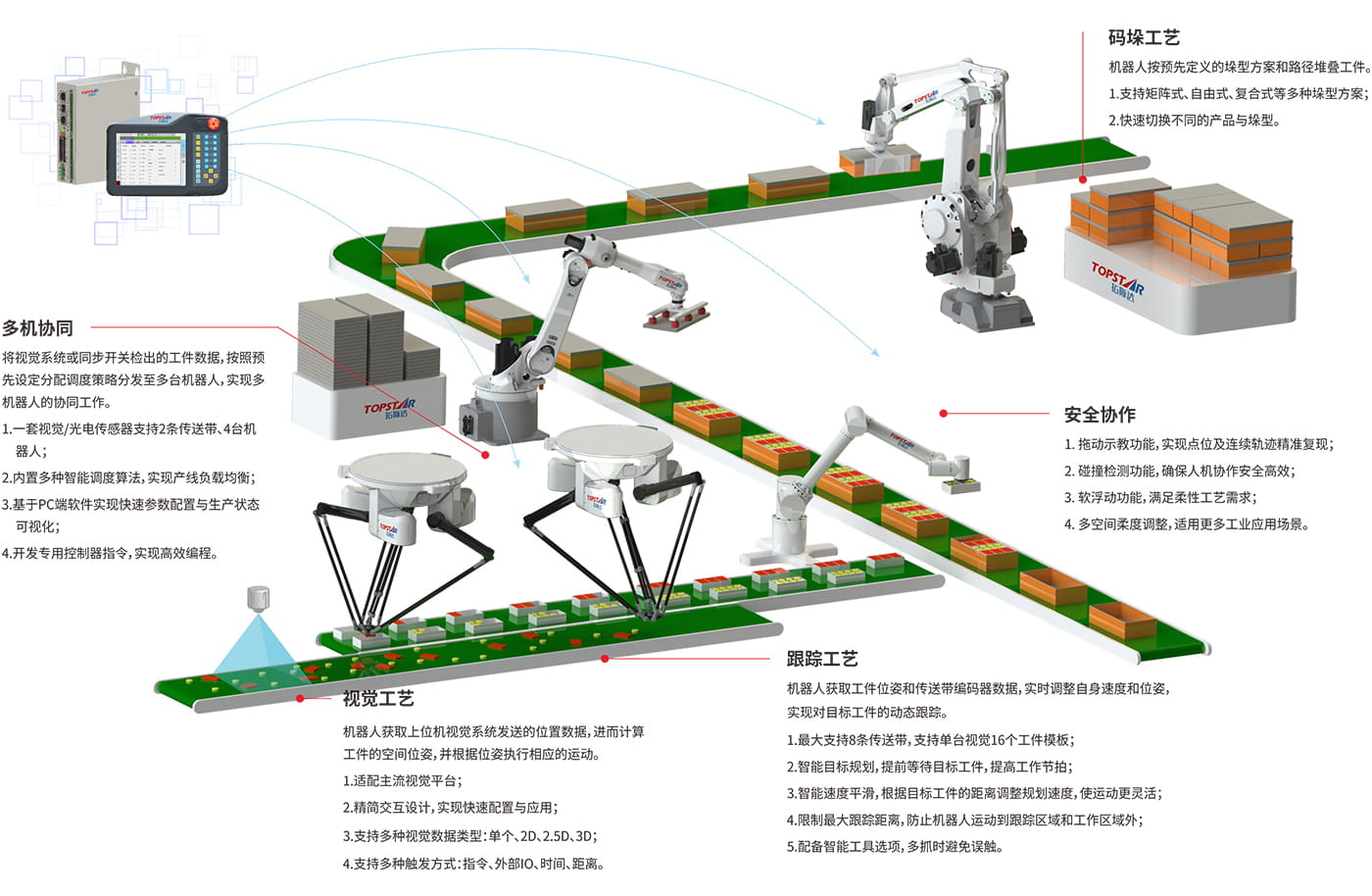 5、豐富的運(yùn)動(dòng)學(xué)和動(dòng)力學(xué)算法庫:系統(tǒng)可以適配通用六關(guān)節(jié)、Delta、SCARA、四軸搬運(yùn)以及各種非標(biāo)結(jié)構(gòu)的機(jī)器人。